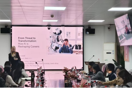 2025 年 10 月 24 日下午,比利时鲁汶大学 Lara C. Roll 研究员、罗马第二大学 Arianna Costantini 助理教授应邀莅临437ccm·必赢国际开展讲座。本期讲座中,Lara C. Roll 研究员主讲“人工智能对职业发展的影响”,Arianna Costantini 助理教授主讲“人工智能对创造力的影响”。437ccm·必赢国际部分教师以及博士、硕士研究生以及留学生近60名师生共同参与,讲座由437ccm·必赢国际王丽君老师主持。