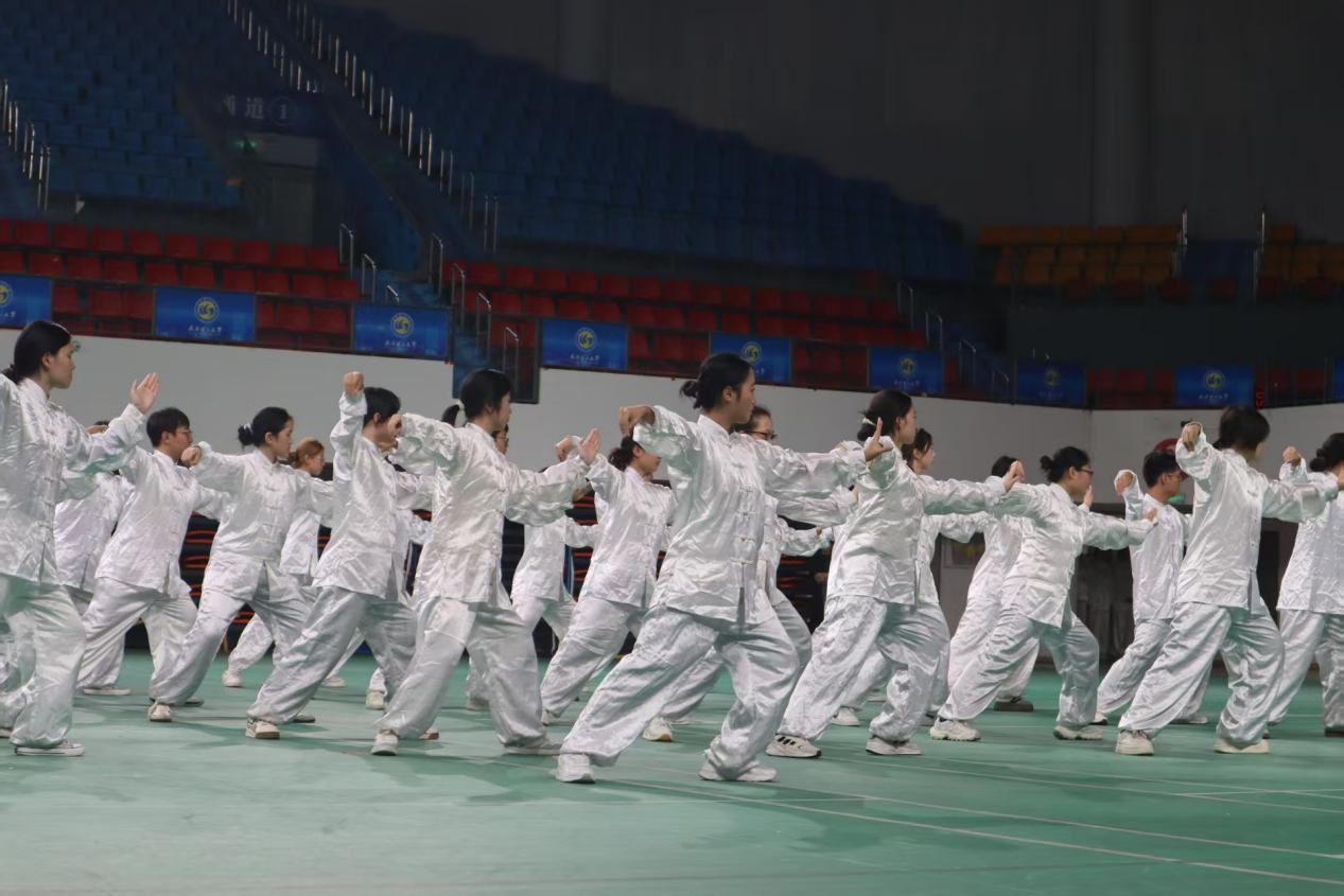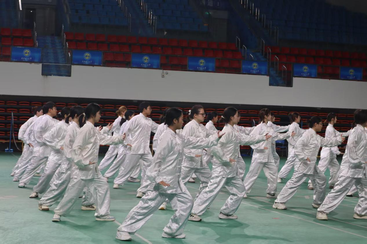 比赛现场,437ccm·必赢国际参赛队员身着统一纯白服装,身姿挺拔如松。伴随着悠扬舒缓的音乐,队员们抬手、转身、推掌、收势,每一个动作都精准到位,既展现了太极拳刚柔并济的独特韵味,又传递出从容沉稳的精神气质。入场环节,队伍齐声喊出“尚管明理,弘商济世”的口号,气势昂扬,瞬间点燃现场气氛,成为赛场上一道亮眼的风景线。