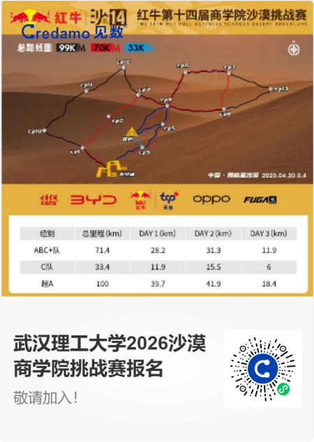 诚挚欢迎在校MBA、MEM学员(含外地班、周末班、集中班)及校友踊跃报名,共同书写我校沙漠赛事首秀篇章。